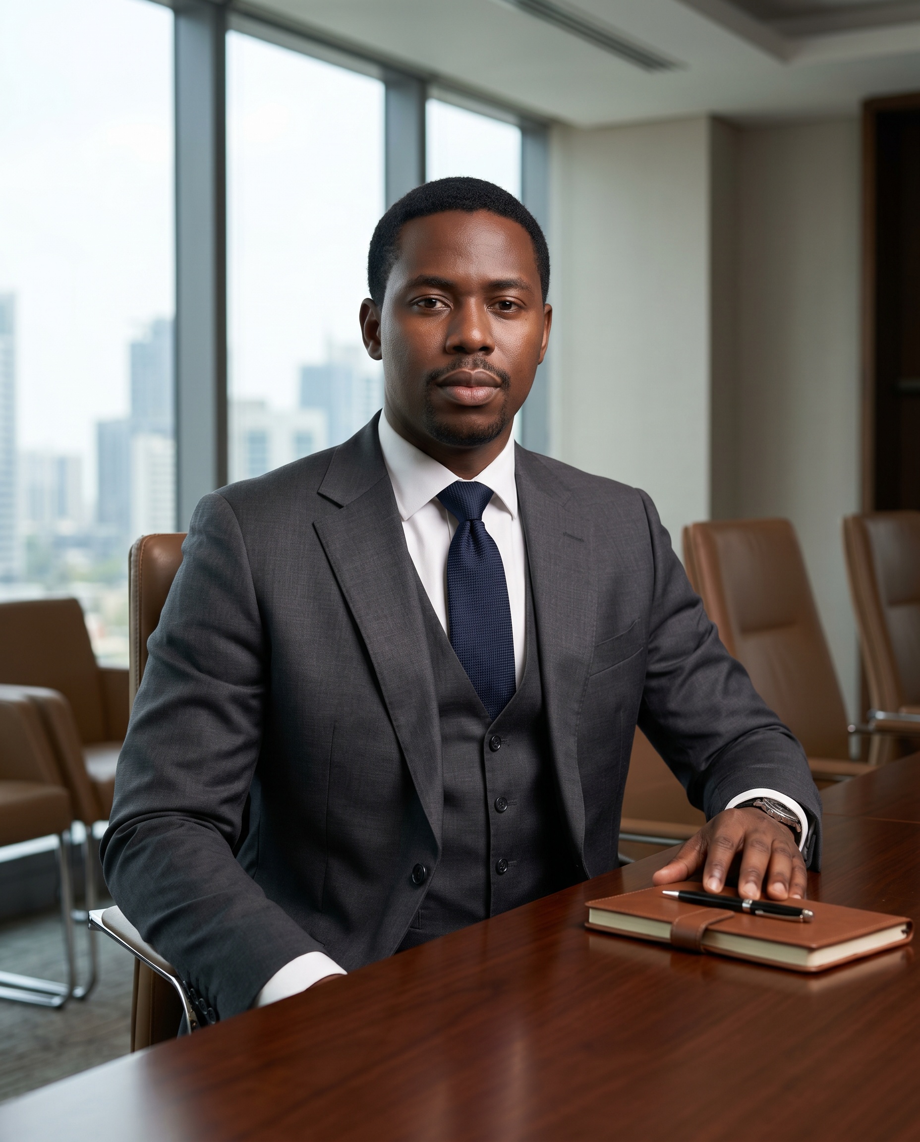 Boardroom Seated is a portrait built for the highest professional register — the kind of image that appears next to a name on an investor deck, a board page, or a company announcement. The setting implies the boardroom without being literal about it. The expression is measured and authoritative.