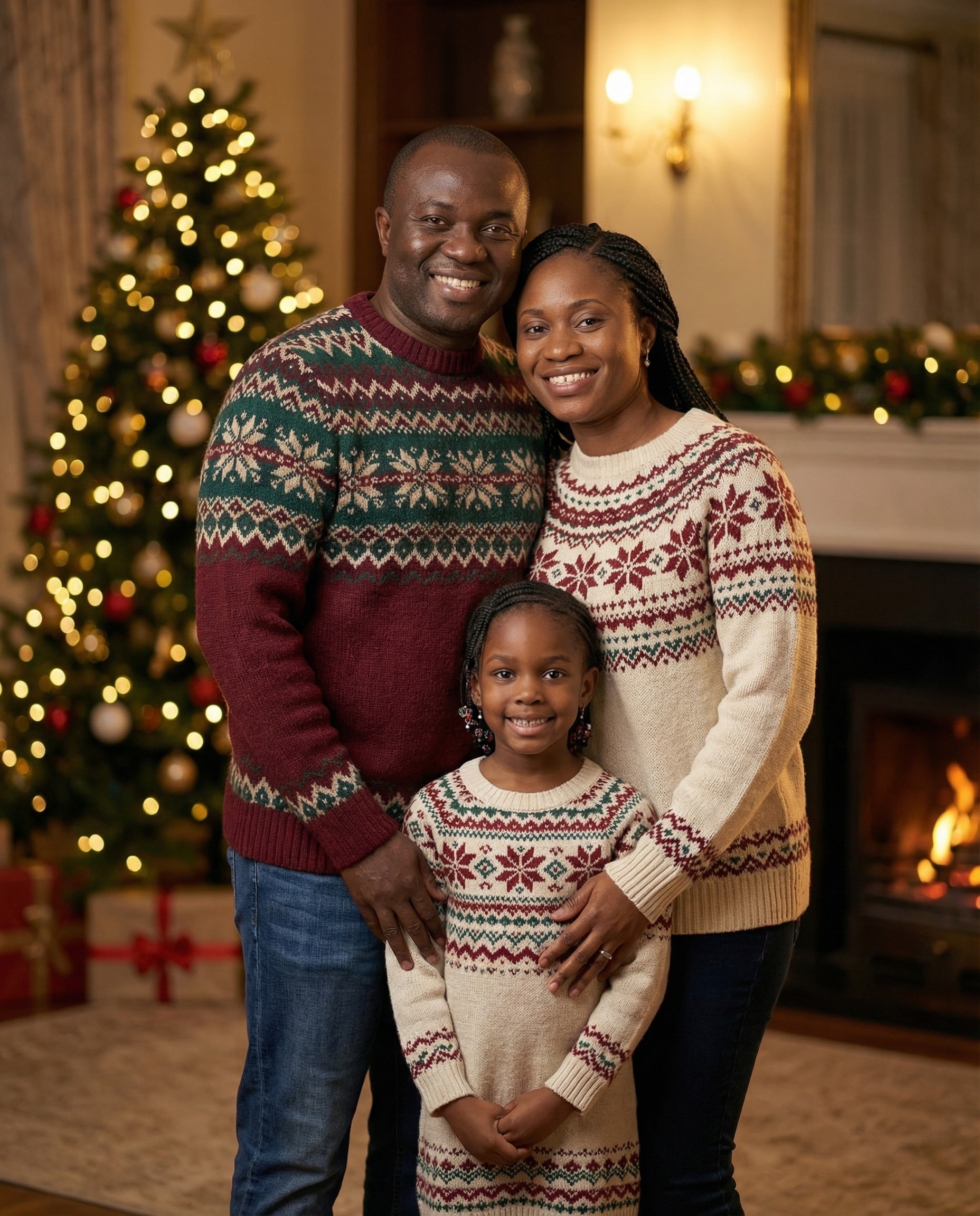 The styling is warm and intentional: cosy knitwear, soft seasonal tones, lighting that feels like Christmas morning rather than a flash photograph. The result is beautiful at any size — profile picture, printed card, or framed display.