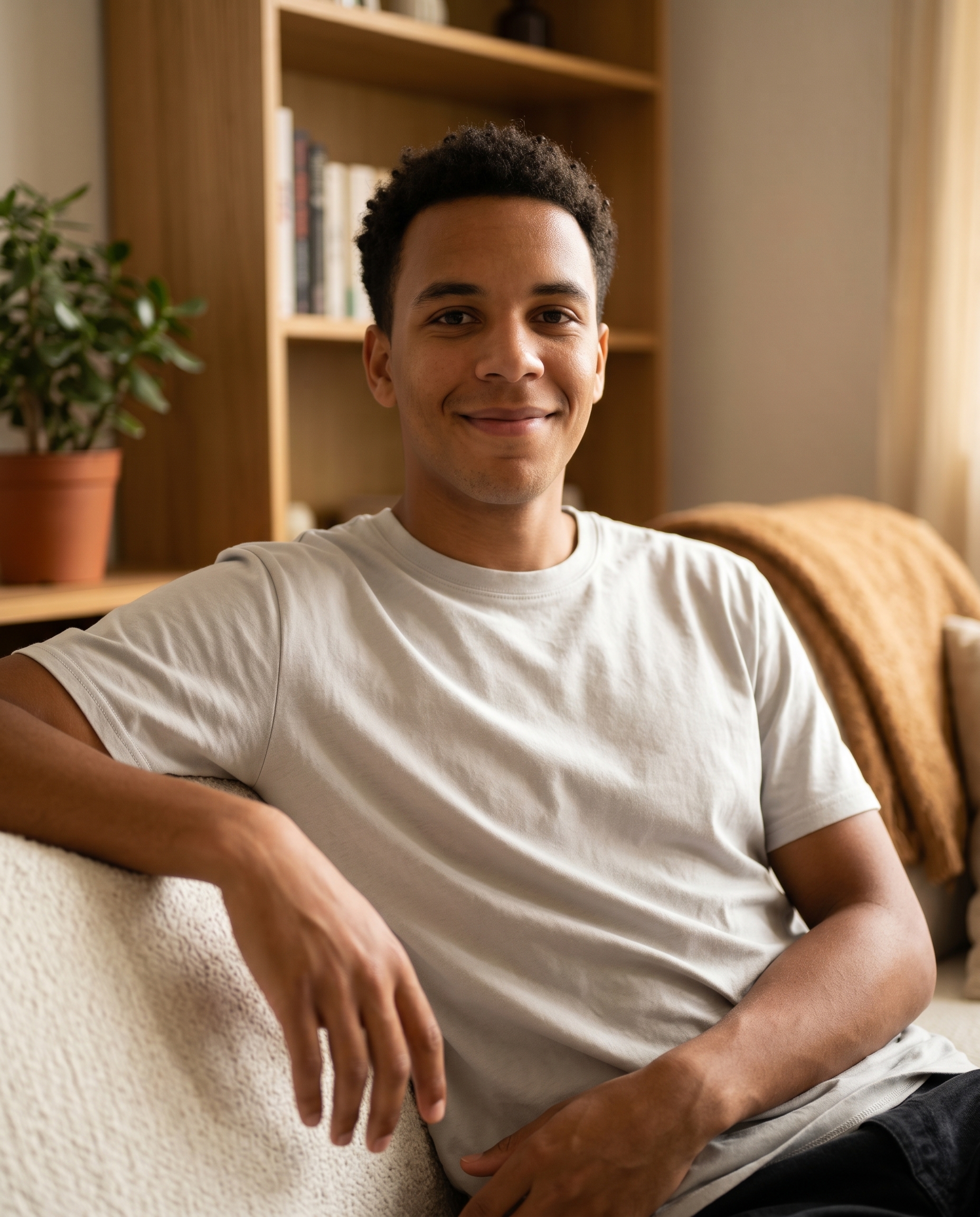This style works for personal social media, dating profiles, and lifestyle content where the goal is to show the real, human version of you rather than the professionally polished one. The home environment communicates comfort and authenticity.