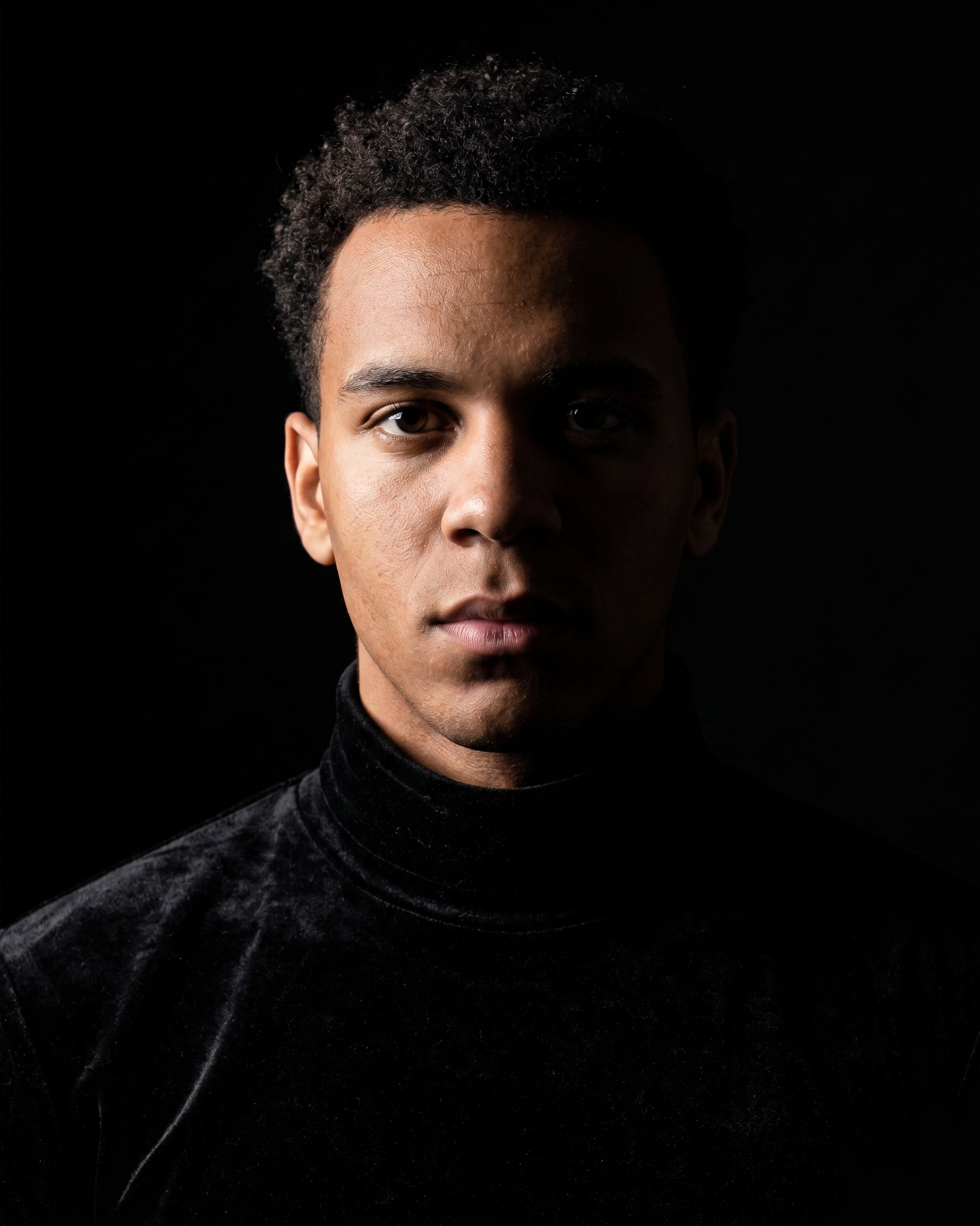 Dramatic Spotlight uses a single directional light source to carve form and depth — the Caravaggio approach. Shadow is not the enemy here. It's the tool that gives the portrait weight and presence.