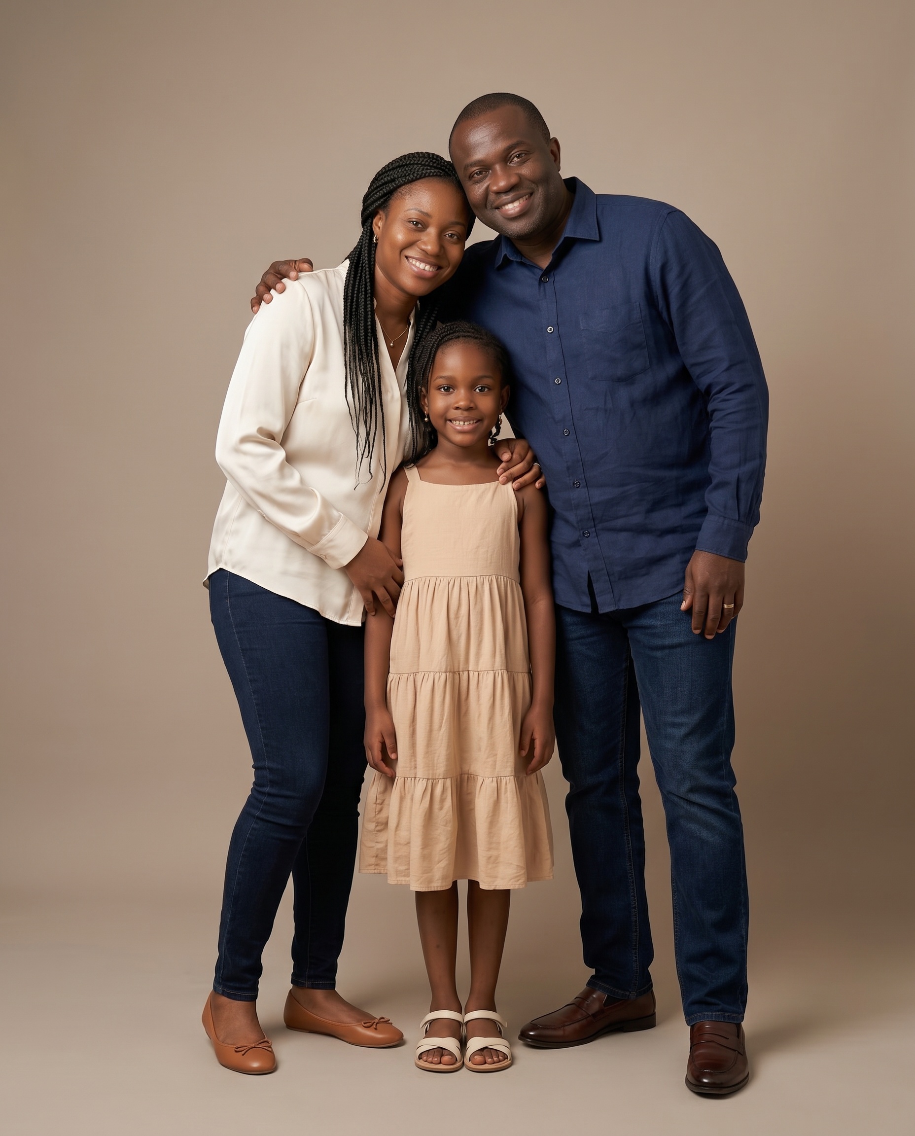 This style produces portraits with the quality of a properly planned family portrait session — controlled lighting, appropriate backdrop, and each person's likeness preserved precisely. The result is an image that actually represents the family, not just documents that everyone was in the same room.
