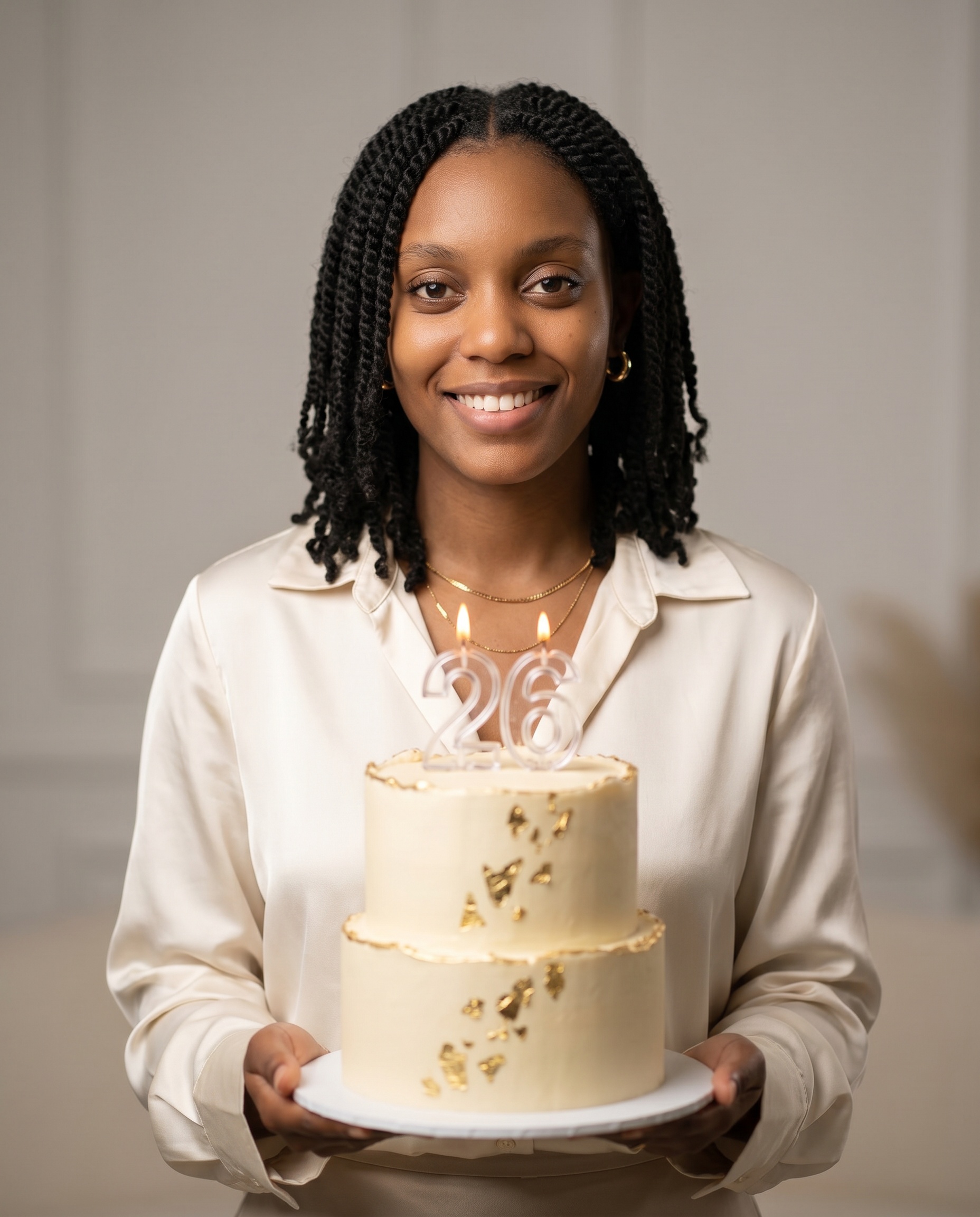 Milestone Cake portraits are built around the most iconic birthday visual — you, a beautiful cake, and your age clearly displayed. The styling is polished and intentional: studio lighting, elegant composition, a cake that looks like it was styled for a magazine shoot.