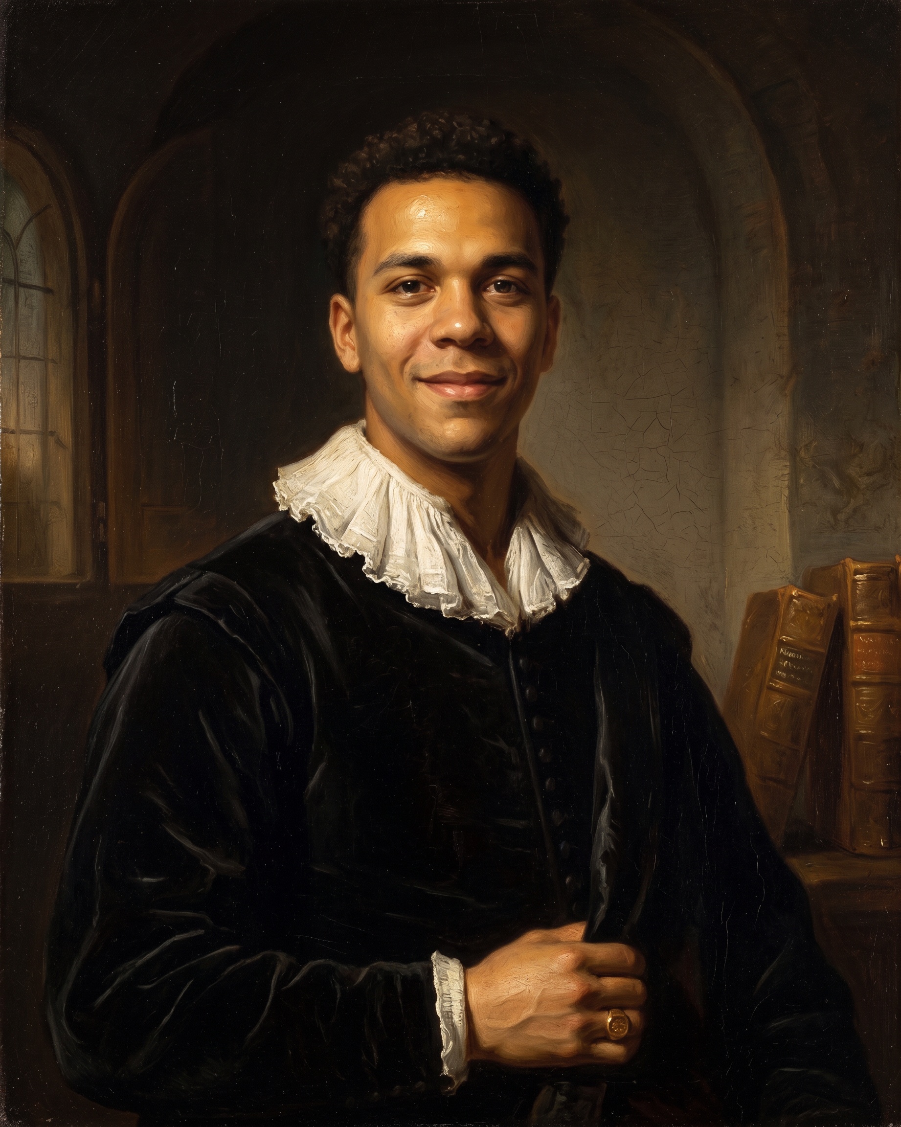 The style applies oil-on-canvas aesthetic: dramatic directional lighting, rich dark backgrounds, period-appropriate attire, and the warm tonal quality of 16th-century Dutch portraiture. Despite the historical reference, the portrait reads as contemporary and deeply personal.