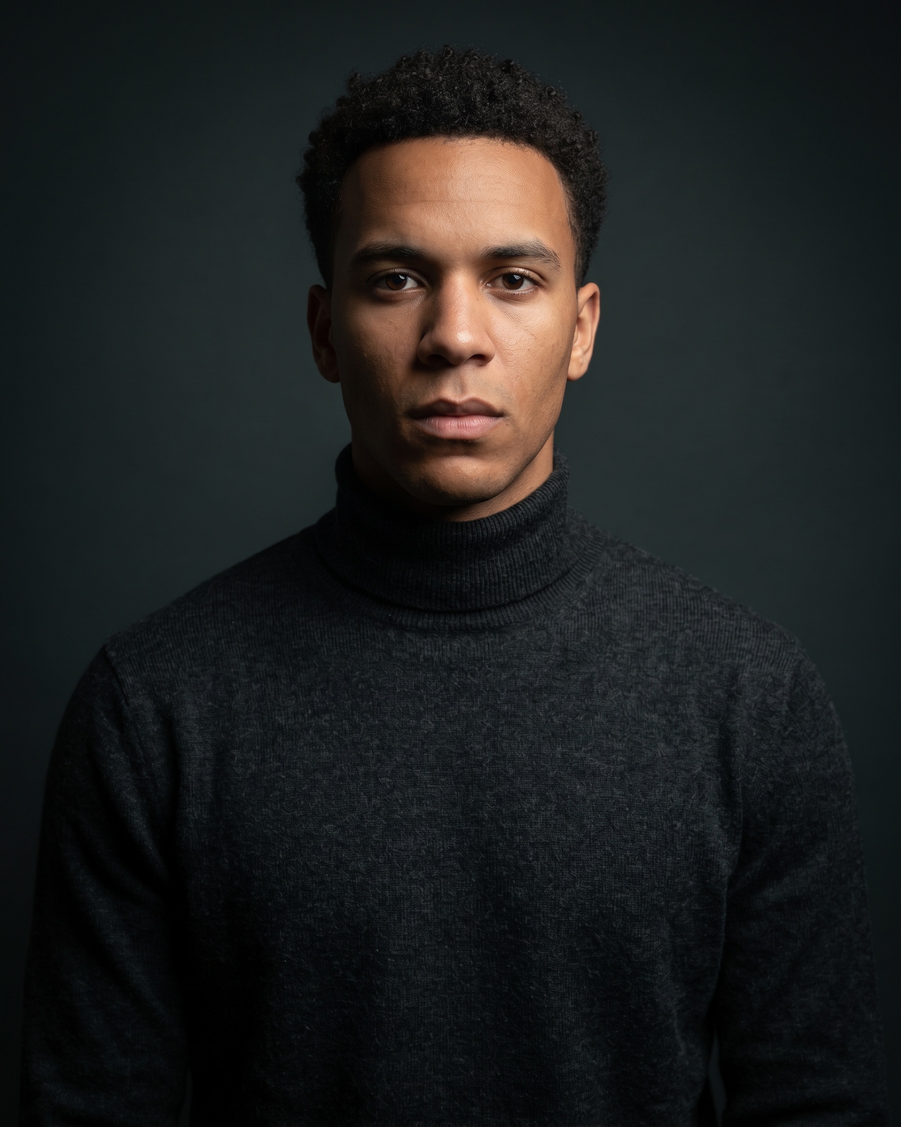 Directional studio light carved into a dramatic, premium portrait.