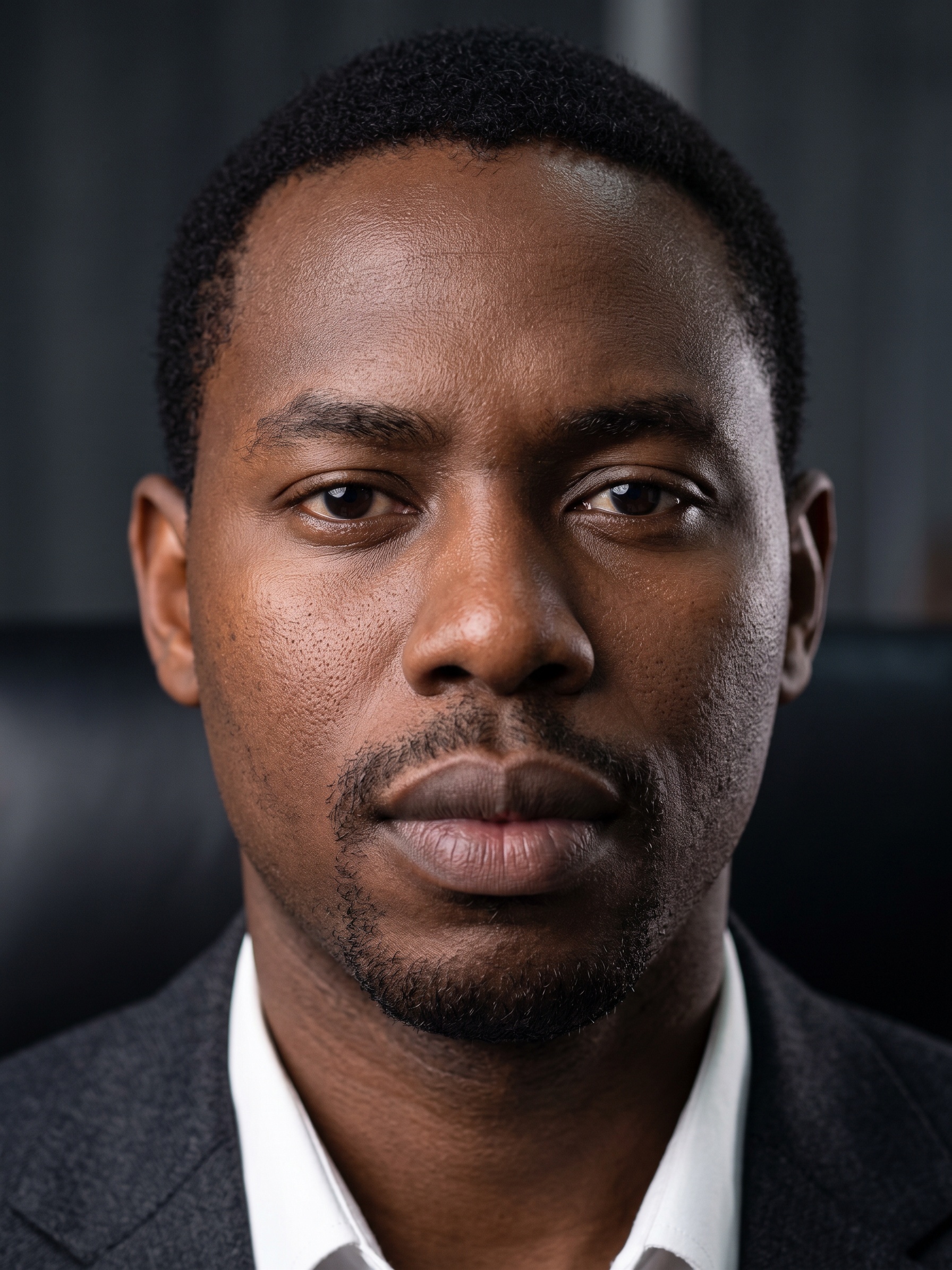 The close crop ensures the portrait works at profile photo size. The expression and lighting ensure it communicates the right register at any size. Upload your photo and generate.