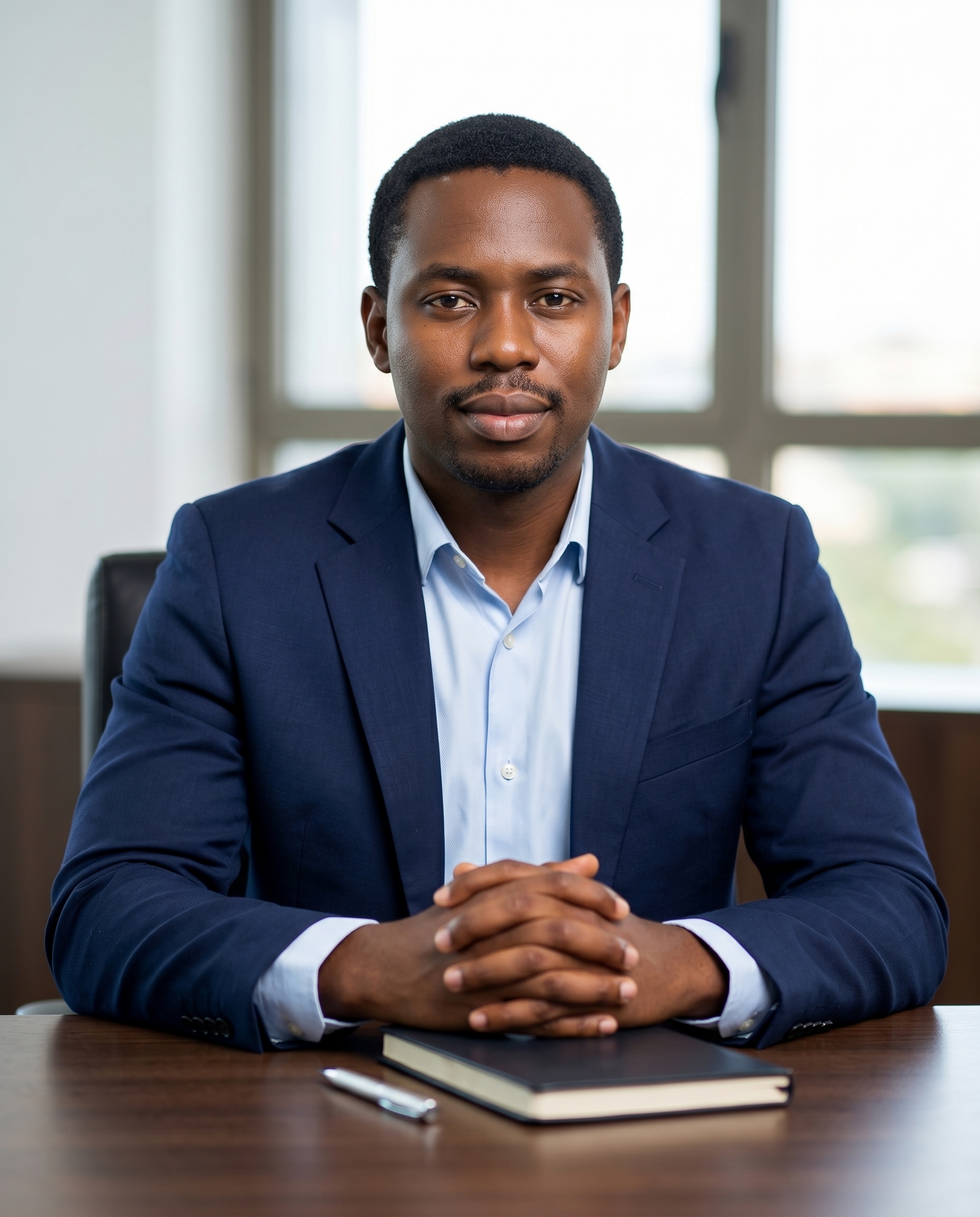 A grounded seated portrait with visible hands and premium realism.