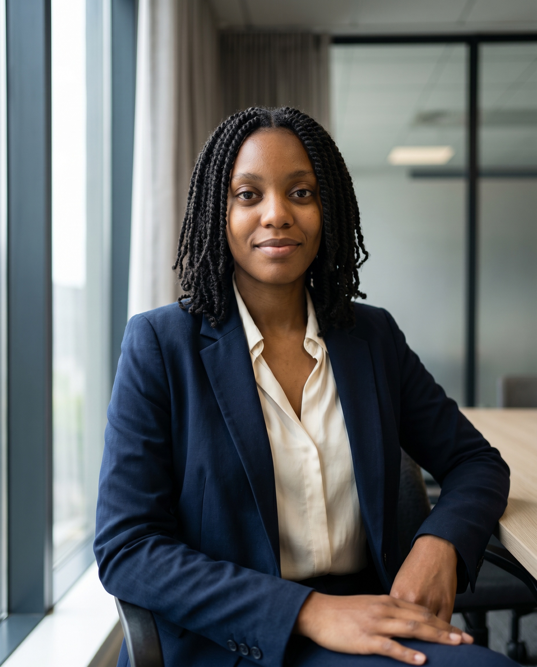 Soft window-lit office portrait with natural elegance and credibility.